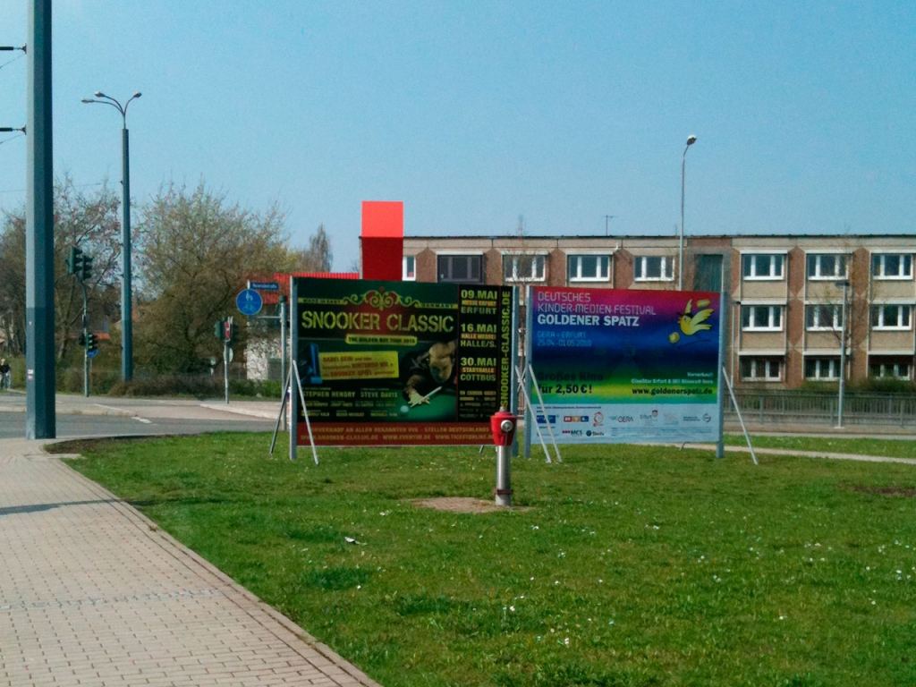 Mit unseren doppelseitigen Stadtinformationsanlagen bzw. Stadtführer haben wir ebenso großformatige Anschlagsflächen an allen Einfahrtsstraßen der Stadt Erfurt für Sie im Angebot. Falls Sie eine extrem werbewirksame Möglichkeit zur Bekanntmachung Ihrer Veranstaltung, Wahl etc. in der Thüringer Landeshauptstadt suchen, dann sind Sie bei uns genau richtig!